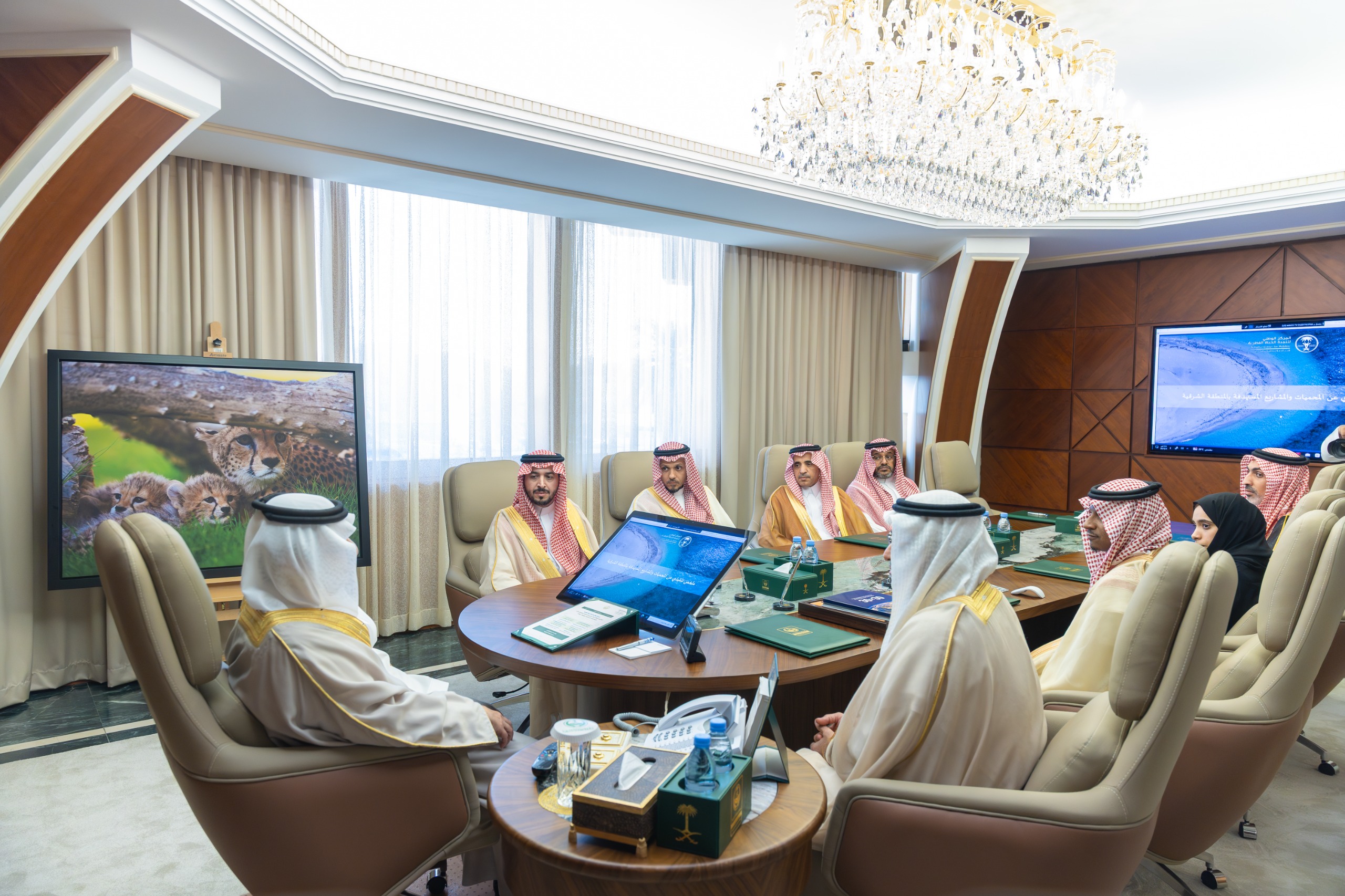 وقدم الرئيس التنفيذي للمركز عرضاً عن جهودهم ومشاريعهم في حماية البيئات البحرية بالمنطقة الشرقية، والمحافظة على التنوع الأحيائي في الخليج العربي، إضافة إلى خطط التوسع في المناطق المحمية تحقيقاً لمستهدفات مبادرة “السعودية الخضراء” الهادفة إلى رفع نسبة المحميات الطبيعية إلى 30% من مساحة المملكة البرية والبحرية بحلول عام 2030 ، مشيراً إلى أن المركز رفع عدداً من المواقع البحرية في المنطقة الشرقية لإعلانها محميات طبيعية جديدة نظراً لأهميتها البيئية العالية، مبينًا أن هذه المواقع تُعد من أبرز الموائل الطبيعية للحياة البحرية في الخليج العربي، حيث تتميّز بوجود شعاب مرجانية عالية الكثافة تضم أكثر من 60 نوعًا، إلى جانب مناطق تعشيش رئيسية للسلاحف البحرية، وأنواع عديدة من الثدييات البحرية تشمل الحيتان والدلافين، إضافة إلى تنوع واسع في الأسماك يتجاوز 540 نوعًا بينها أنواع مهددة بالانقراض.