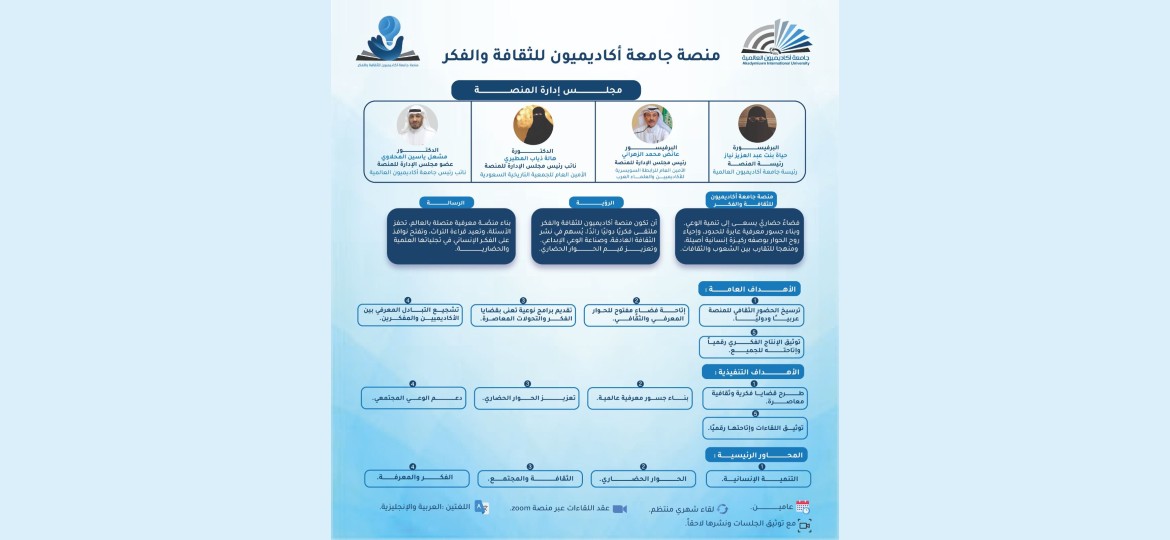 وتهدف المنصّة إلى ترسيخ الحضور الثقافي عربيًا ودوليًا، وتقديم برامج نوعية تُعنى بقضايا الفكر والتحوّلات المعاصرة، وتشجيع التبادل المعرفي، وتوثيق الإنتاج الفكري رقميًا وإتاحته للجميع.
