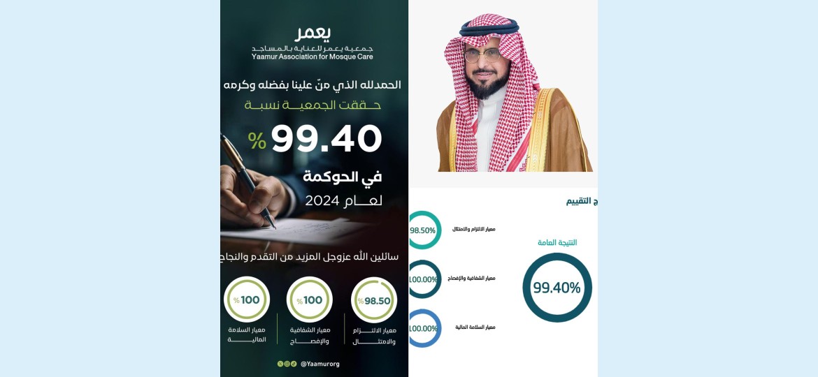 حققت جمعية يعمر للعناية بالمساجد نتيجة 99.40% في التقييم الشامل لمعايير الحوكمة لسنة التقييم 2024، والذي يشمل معايير الالتزام والامتثال والشفافية والإفصاح والسلامة المالية, ويأتي هذا الإنجاز ليضع الجمعية ضمن أعلى الجهات المستوفية لمتطلبات الحوكمة على مستوى القطاع غير الربحي.