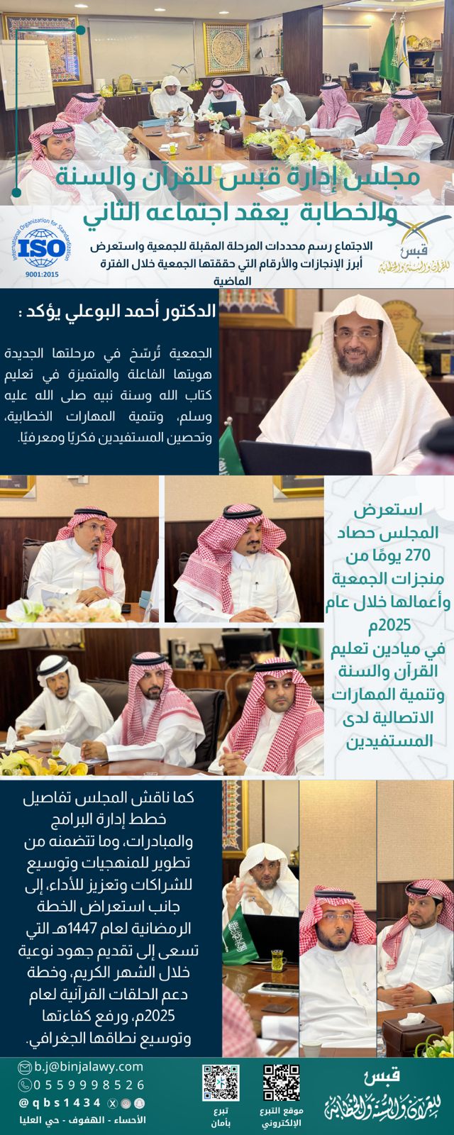 وخلال الاجتماع، استعرض المجلس حصاد 270 يومًا من منجزات الجمعية وأعمالها خلال عام 2025م، وما تحقق فيها من تطور لافت على مستوى البرامج القرآنية والدعوية والخطابية.