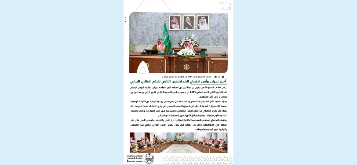 ونوَّه سموه خلال الاجتماع بما تحظى به المنطقة من دعم سخي ورعاية كريمة من القيادة الرشيدة -أيدها الله-، مؤكدًا أهمية العمل على تحقيق الهدف الأسمى في رفع كفاءة الخدمات في منطقة نجران بما يخدم الأهالي من خلال العمل الجماعي والشفافية في اتخاذ القرارات، والأخذ بالاعتبار إعداد وتنظيم مبادرات مبتكرة وتبادل الخبرات بين المحافظات والمراكز.