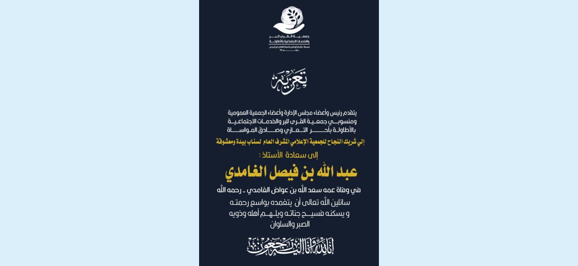 يتقدم رئيس وأعضاء مجلس الإدارة وأعضاء الجمعية العمومية ومنسوبي جمعية القرى للبر والخدمات الاجتماعية بالأطاولة بأحر التعازي وصادق المواساة إلي شريك النجاح للجمعية الإعلامي المشرف العام لسناب بيدة ومعشوقة إلى الأستاذ عبد اللّٰه بن فيصل الغامدي في وفاة عمه " المرحوم " سعد اللّٰه بن عواض الفامدي - رحمه اللّٰه سائلين اللّٰه تعالى أن يتفمده بواسع رحمته ويسكنه فسيح جناته ويلهم أهله وذويه