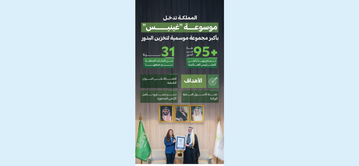 حققت المملكة العربية السعودية إنجازًا بيئيًّا عالميًّا جديدًا، بتسجيلها رقمًا قياسيًا في موسوعة غينيس للأرقام القياسية تحت عنوان "أكبر مجموعة موسمية لتخزين البذور في العالم"، في خطوة تعكس التزامها المتواصل بحماية البيئة وتعزيز الاستدامة.