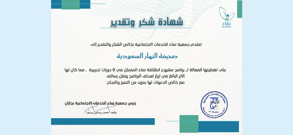 تقدمت جمعية نماء للخدمات الاجتماعية بخالص الشكر والتقدير إلى صحيفة النهار السعودية، على تغطيتها الفعالة لـ برنامج مشروع انطلاقة نماء المتمثل في 8 دورات تدريبية، مما كان لها الأثر البالغ في إبراز أهداف البرنامج ونقل رسالته.