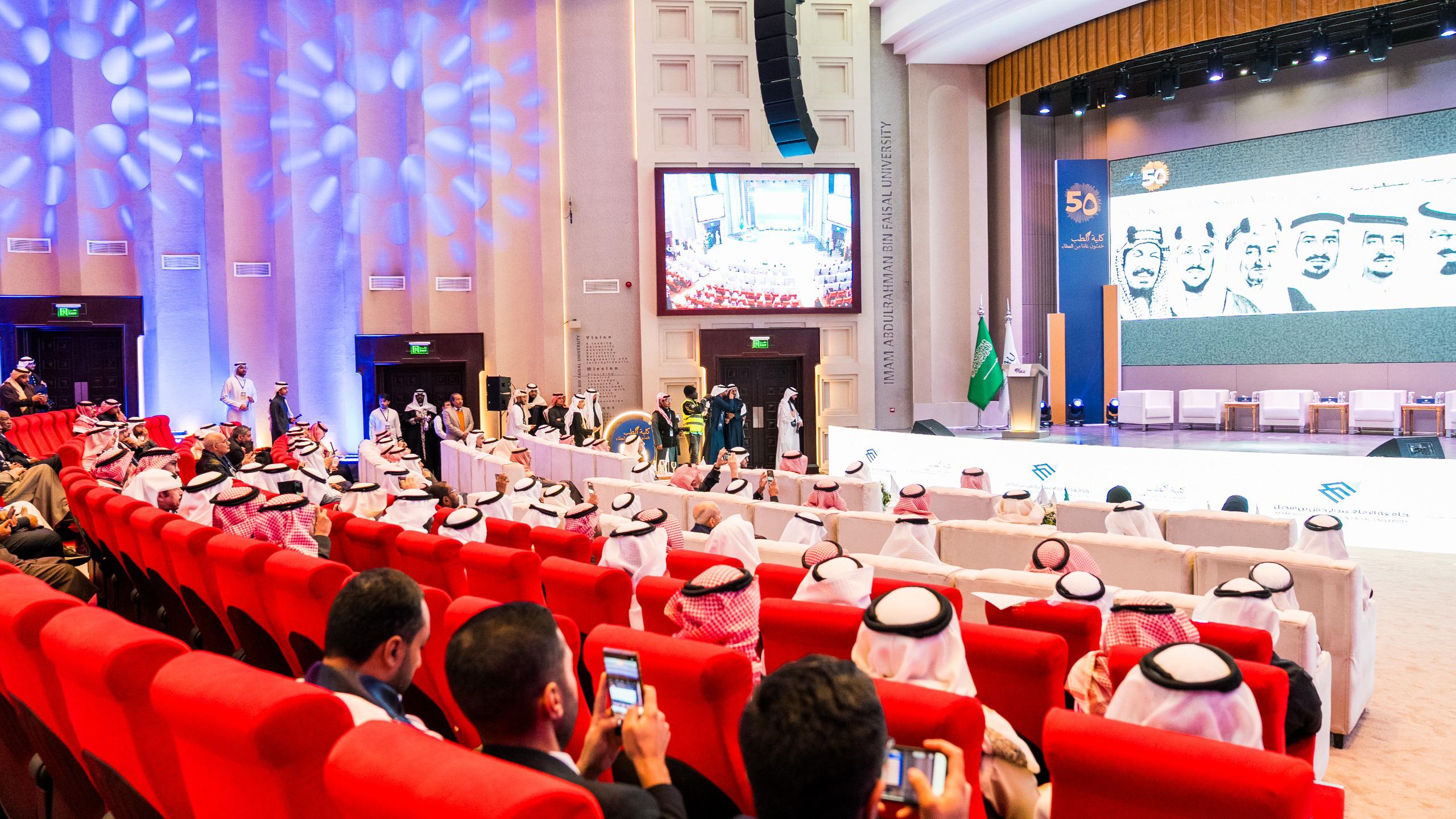 وفي كلمته، أكد رئيس الجامعة الأستاذ الدكتور فهد بن أحمد الحربي أن الاحتفال باليوبيل الذهبي لكلية الطب هو احتفاء بمسيرة بناء ممتدة، وصناعة الطبيب والإنسان معًا، مشيرًا إلى أن الكلية شكّلت أحد الأعمدة الراسخة في مسيرة الجامعة، وأسهمت على مدى خمسة عقود في تطوير التعليم الطبي، وتعزيز البحث العلمي، والارتقاء بالخدمات الصحية، ضمن منظومة أكاديمية وسريرية متكاملة وأوضح أن جامعة الإمام عبدالرحمن بن فيصل، وبتكامل أدوارها التعليمية والبحثية والمجتمعية، تسير بثباتٍ مع مستهدفات رؤية السعودية 2030، مؤكدًا أن كلية الطب كانت ولا تزال نموذجًا للالتزام والتميّز، بفضل كوادرها وقياداتها ورؤيتها الطموحة التي تستشرف المستقبل بثقة.