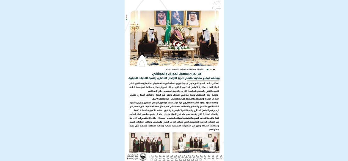 وشهد سموه توقيع مذكرة تفاهم بين فرع مركز الملك عبدالعزيز للتواصل الحضاري بنجران والإدارة العامة للتدريب التقني والمهني بالمنطقة.