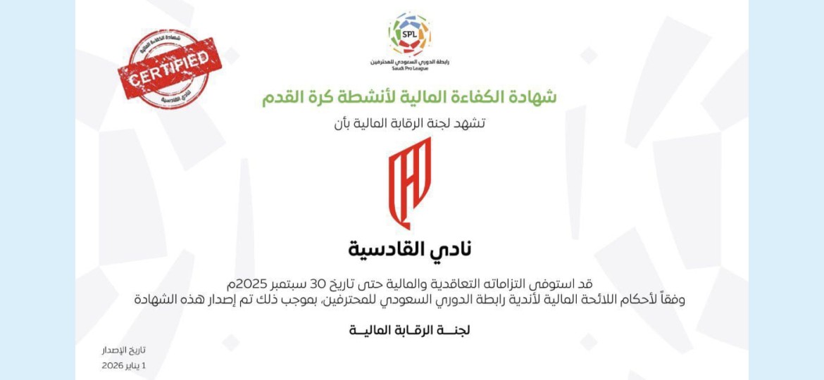 أعلنت لجنة الرقابة المالية لأندية رابطة الدوري السعودي للمحترفين، صدور شهادة الكفاءة المالية لأنشطة كرة القدم لنادي القادسية، وذلك وفقًا لأحكام اللائحة المالية لأندية الرابطة، بعد استيفاء النادي لجميع المتطلبات والمعايير المعتمدة.