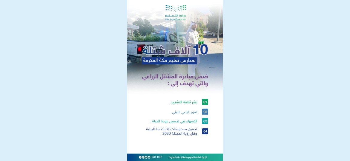 أطلقت الإدارة العامة للتعليم بمنطقة مكة المكرمة، ممثلة في قسم المسؤولية المجتمعية، مبادرة "المشتل الزراعي"؛ بهدف تحسين البيئة المدرسية وتعزيز أنسنة المباني التعليمية، من خلال توفير أكثر من 10,000 شتلة لتوزيعها على مدارس المنطقة.