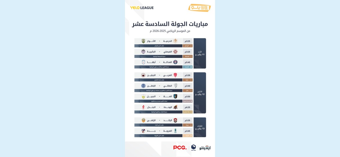 تنطلق مساء الأحد منافسات الجولة السادسة عشرة من دوري يلو لأندية الدرجة الأولى للمحترفين، في جولة تُعد من أكثر الجولات سخونة هذا الموسم، عقب أحداث مثيرة في الجولة الماضية شهدت حسم أبها لقمة الدوري أمام الدرعية وتوسيع الفارق في الصدارة، إلى جانب الخسارة الأولى للفيصلي وتحقيق الجبيل فوزه الأول.