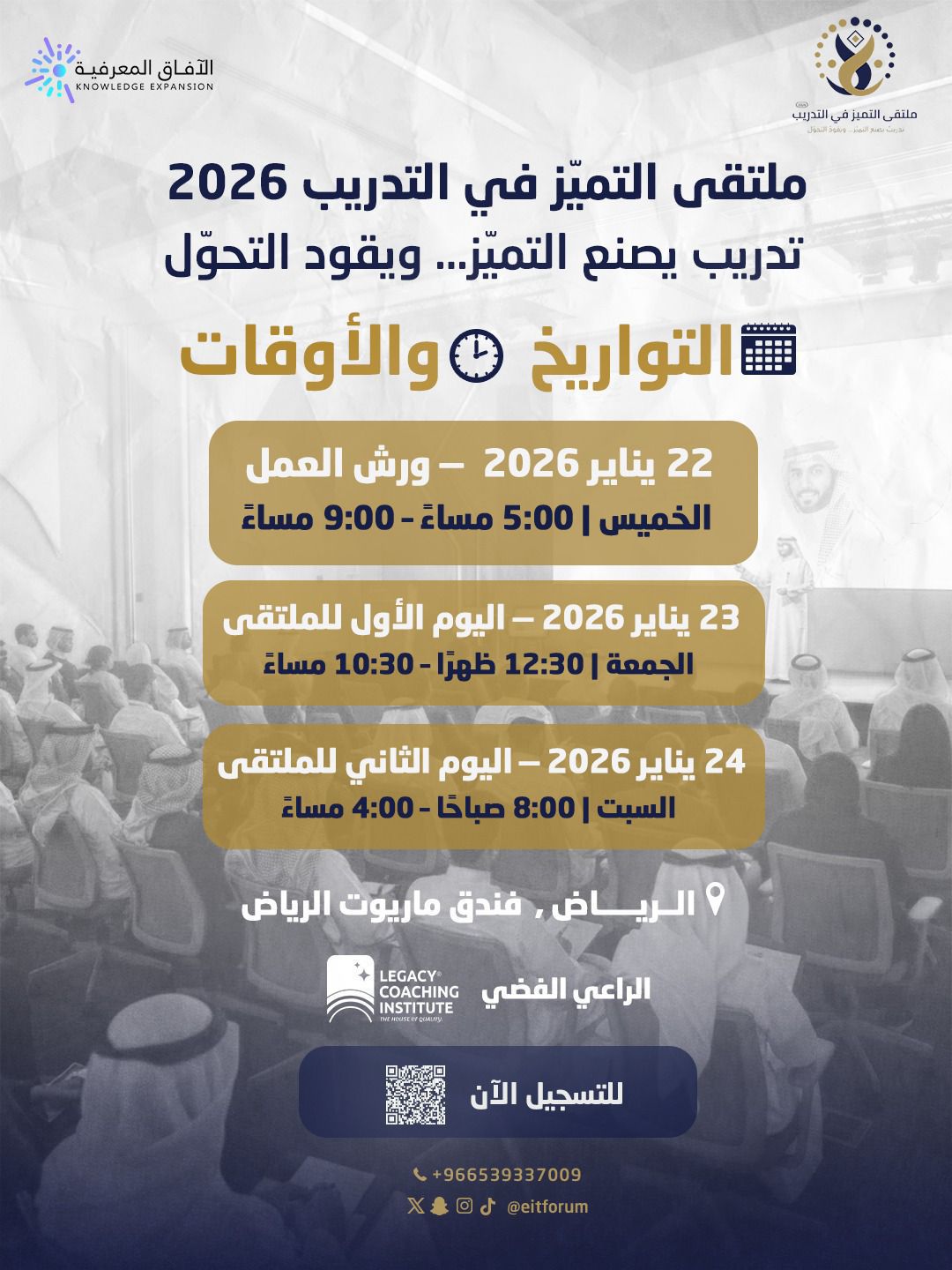 تنطلق بعد حوالي اسبوعين من الآن وبالتحديد في 22 من شهر يناير الجاري فعاليات النسخة الثانية من ملتقى التميز في التدريب الذي تنظمه مؤسسة الآفاق المعرفية لتنظيم المعارض والمؤتمرات، بمشاركة 70 متحدثًا خليجيًا وعربيًا، وذلك بفندق ماريوت الرياض على مدى ثلاثة أيام ، 22 - 24 يناير 2026 .