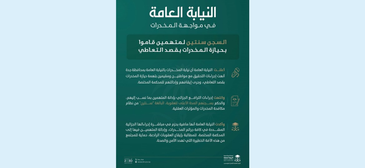 وأكدت النيابة العامة أنها ماضية بحزم في مباشرة إجراءاتها الجزائية المشددة في كافة جرائم المخدرات، وإحالة المتهمين فيها إلى المحكمة المختصة، للمطالبة بإيقاع العقوبات الرادعة، حماية للمجتمع من هذه الآفة الخطيرة التي تهدد الأمن والصحة.