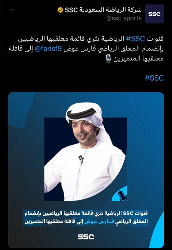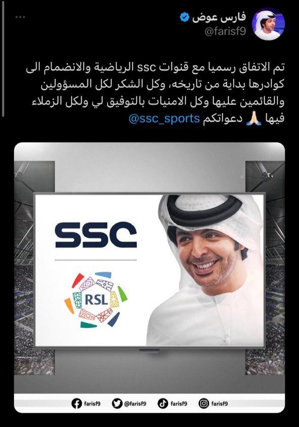 وجاء في تغريدة حساب شبكة قنوات السعودية الرياضية :"قنوات SSC الرياضية تثري قائمة معلقيها الرياضيين بإنضمام المعلق الرياضي فارس عوض @farisf9 إلى قافلة معلقيها المتميزين"