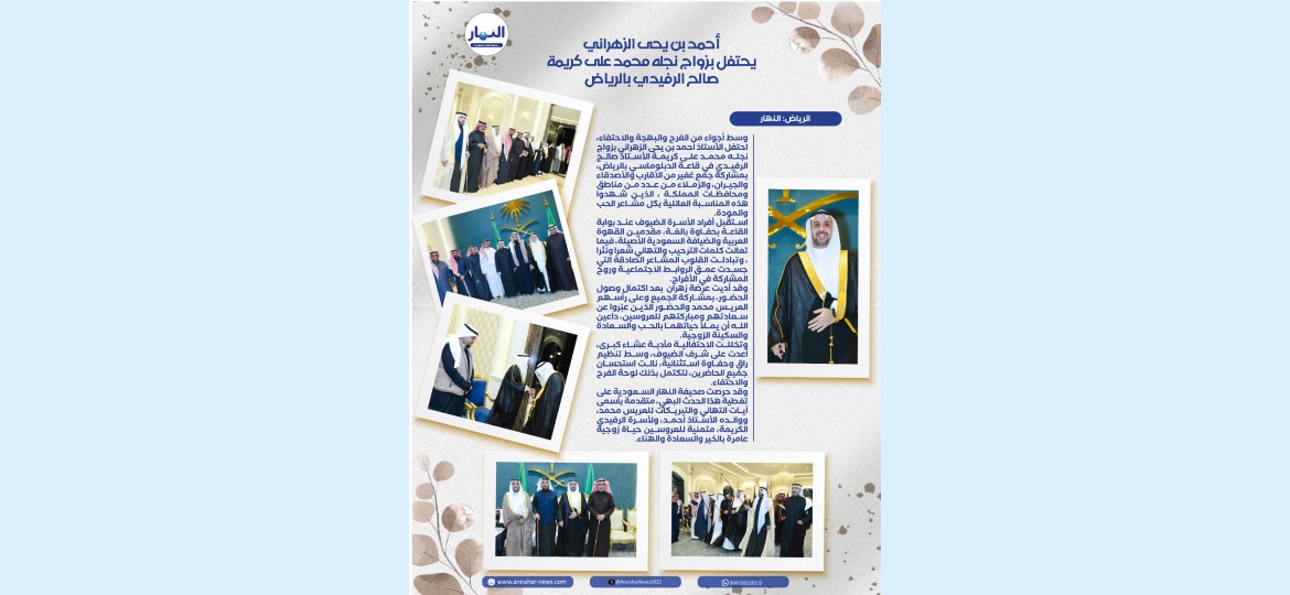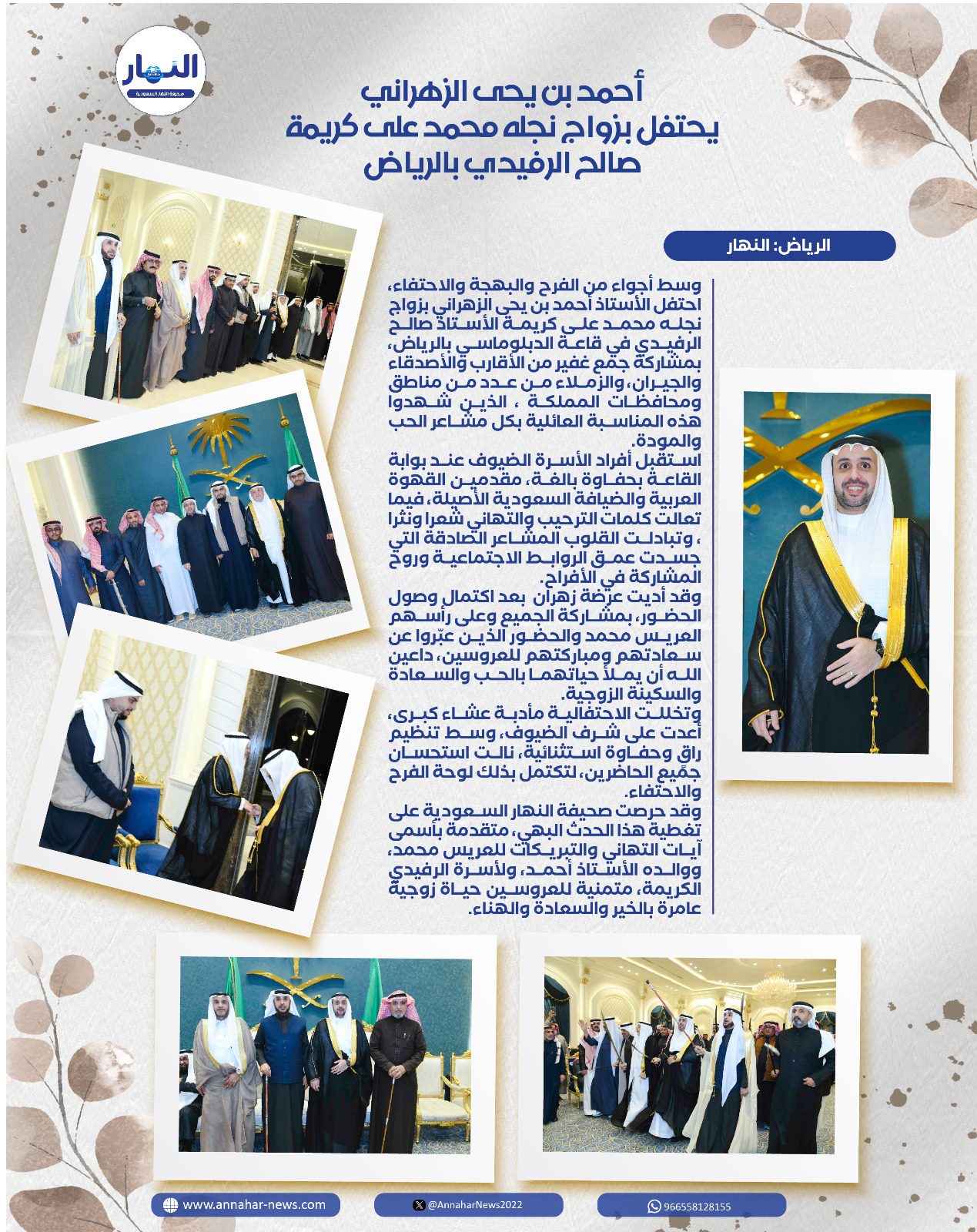 وقد حرصت صحيفة النهار السعودية على تغطية هذا الحدث البهي، متقدمة بأسمى آيات التهاني والتبريكات للعريس محمد، ووالده الأستاذ أحمد، ولأسرة الرفيدي الكريمة، متمنية للعروسين حياة زوجية عامرة بالخير والسعادة والهناء.