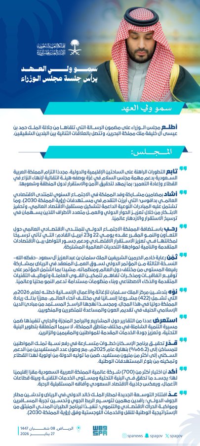 وفي بداية الجلسة؛ أطلع سمو ولي العهد، مجلس الوزراء على مضمون الرسالة التي تلقاها من جلالة الملك حمد بن عيسى آل خليفة ملك مملكة البحرين، وتتصل بالعلاقات الثنائية بين البلدين الشقيقين.
