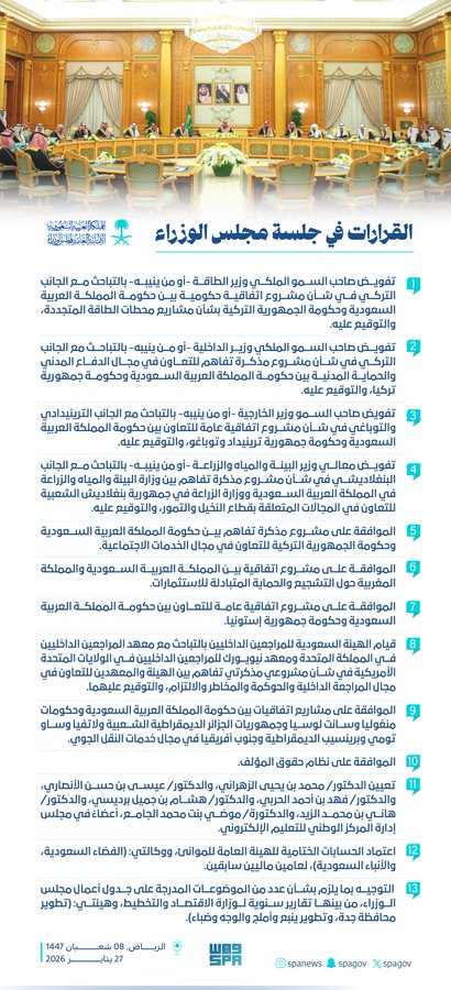تفويض صاحب السمو الملكي وزير الطاقة -أو من ينيبه- بالتباحث مع الجانب التركي في شأن مشروع اتفاقية حكومية بين حكومة المملكة العربية السعودية وحكومة الجمهورية التركية بشأن مشاريع محطات الطاقة المتجددة، والتوقيع عليه.
