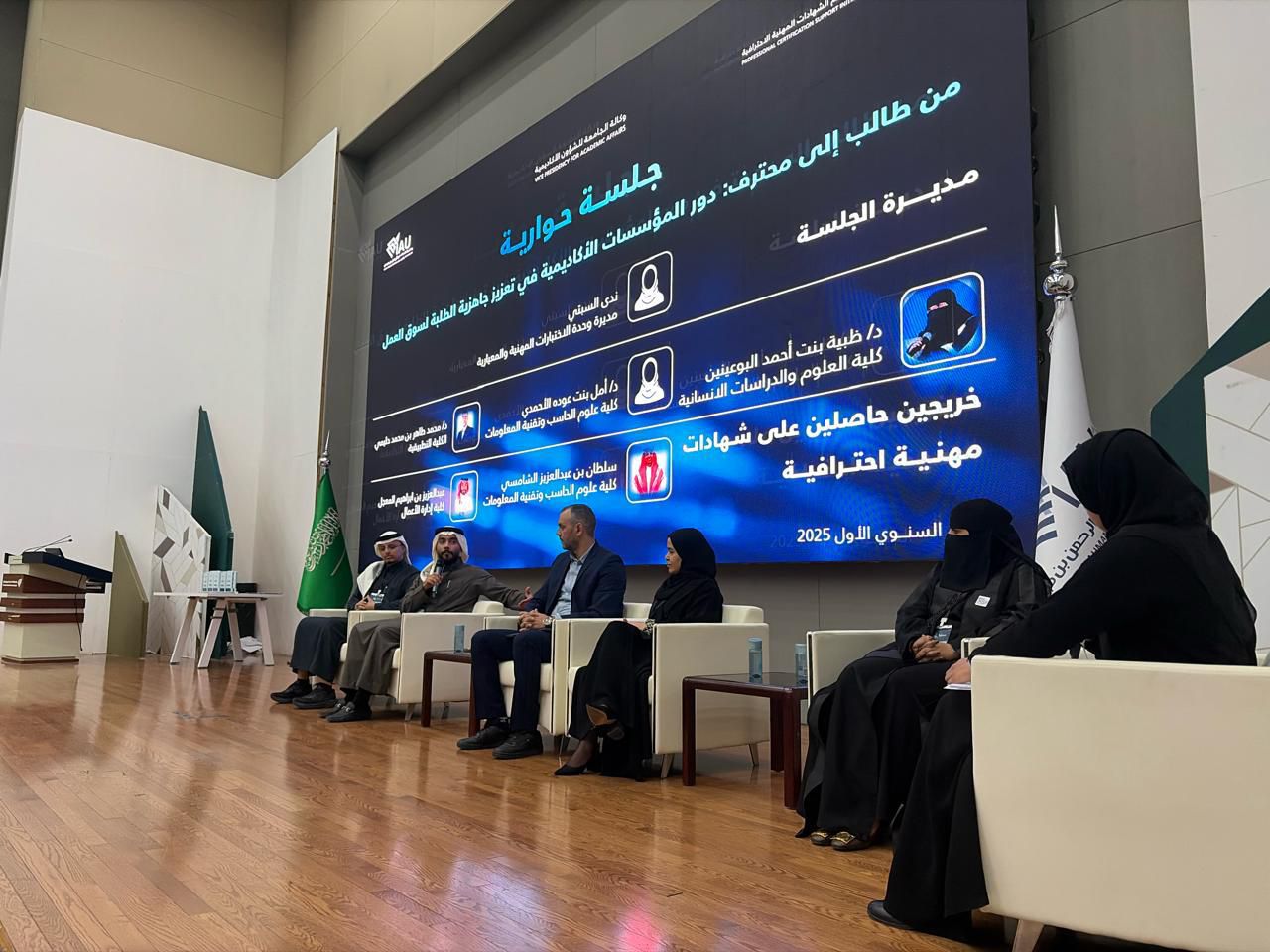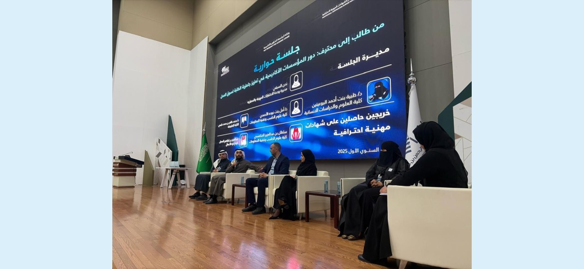 وتضمّن اللقاء جلسة حوارية بعنوان «من طالب إلى محترف: دور المؤسسات الأكاديمية في تعزيز جاهزية الطلبة لسوق العمل»، شارك فيها عدد من أعضاء هيئة التدريس وخريجين حاصلين على شهادات مهنية احترافية، استعرضوا خلالها تجاربهم المهنية وأثر الشهادات الاحترافية في تعزيز فرص التوظيف والتطور المهني.