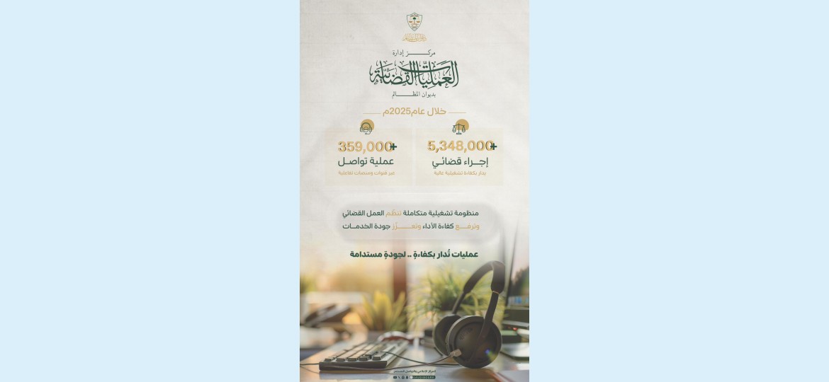 أعلن ديوان المظالم ممثلًا في مركز إدارة العمليات القضائية عن تحقيق أرقام تشغيلية تعكس حجم العمل وكفاءة الأداء خلال عام 2025م، حيث بلغ إجمالي الإجراءات القضائية التي نفذها المركز 5,348,020 إجراء قضائي، شملت قيد وإحالة الطلبات، وتسليم الأحكام، ومعالجة مختلف الإجراءات التشغيلية المرتبطة بسير العمل القضائي.