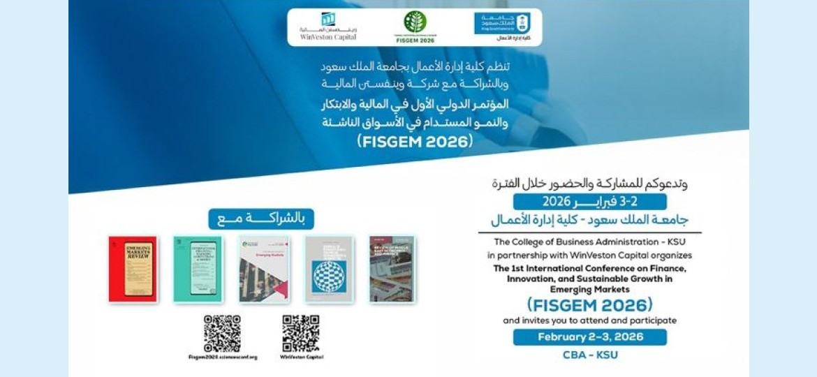 تنظم جامعة الملك سعود ممثلة بكلية إدارة الأعمال المؤتمر الدولي الأول في المالية والابتكار والنمو المستدام في الأسواق الناشئة (FISGEM)، بالشراكة مع شركة وينفستن المالية (Winveston)، وذلك يومي الاثنين والثلاثاء 2–3 فبراير 2026م، في رحاب الكلية .