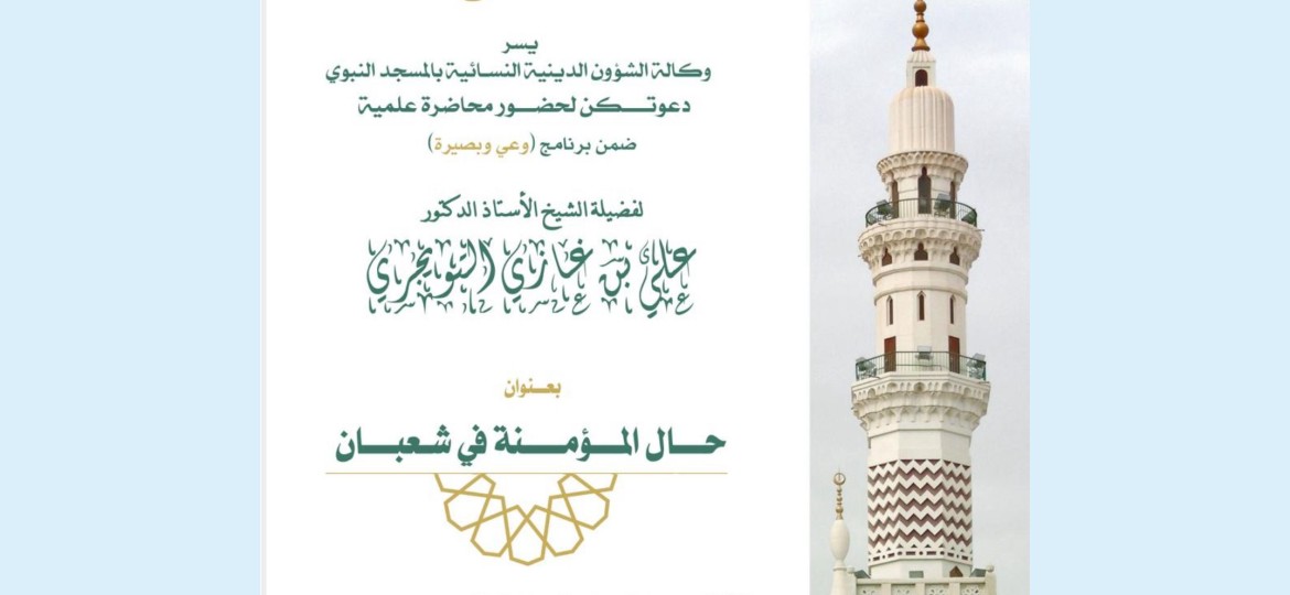 وكالة الشؤون الدينية النسائية في المسجد النبوي الشريف تواصل تنفيذ الخطة التشغيلية وتفعيل المحاضرات العلمية ضمن برنامج (وعي وبصيرة)، والتي قدمت من قبل فضيلة الشيخ الأستاذ الدكتور (علي بن غازي التويجري) بعنوان(حال المؤمنة في شعبان).