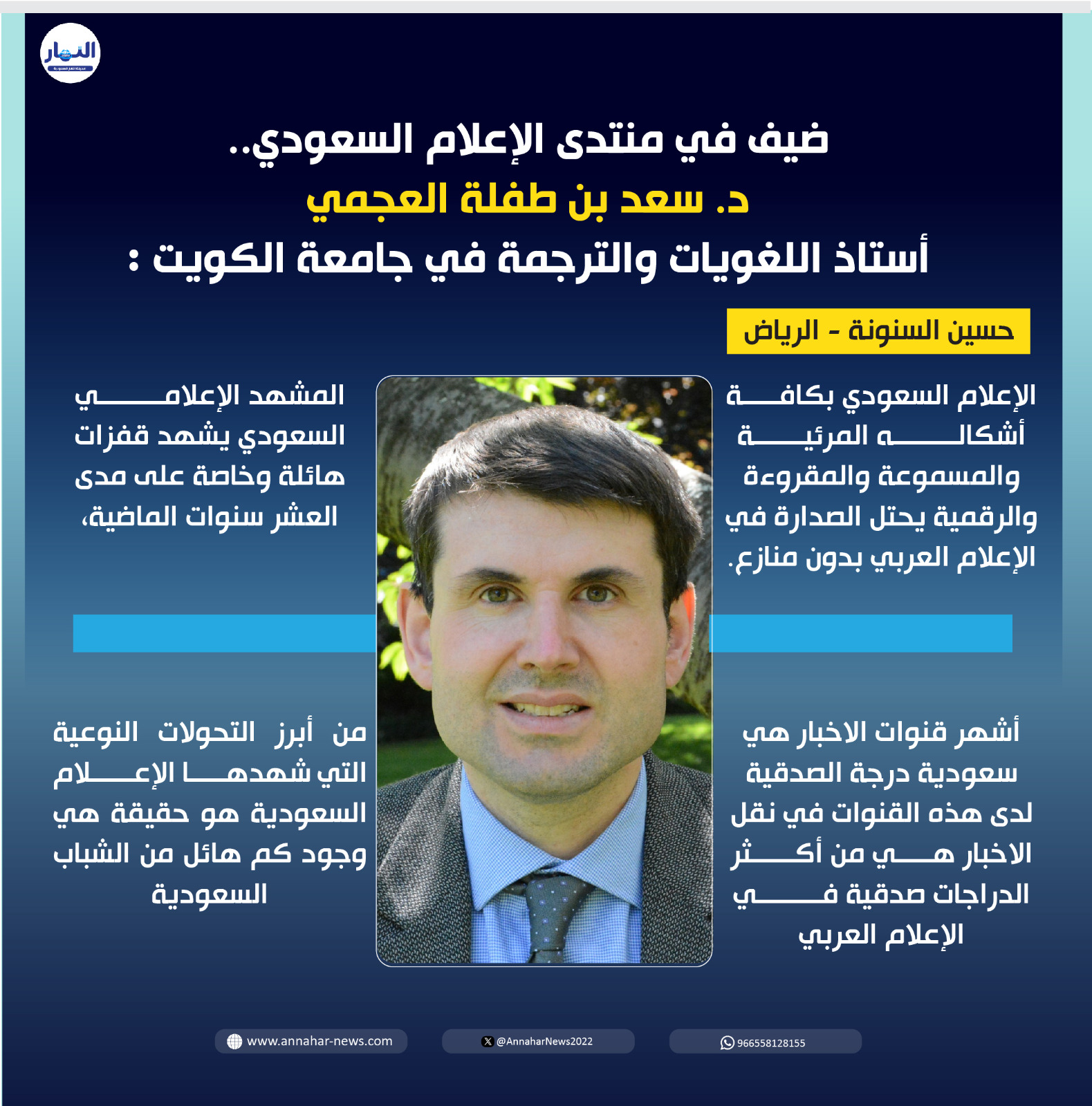 يقول المحلل الاستراتيجي د. جيفري ميلر واحد المتحدثين في منتدى السعودي للإعلام "لصحيفة النهار" بصفتي محللاً جيوسياسياً واستراتيجياً من نيوزيلندا، متخصصاً في منطقة الخليج، فقد تابعتُ عن كثب تطور مبادرات الإعلام السعودي، لا سيما في سياق تداخلها مع رؤية 2030 الرامية إلى التنويع والانخراط العالمي.
