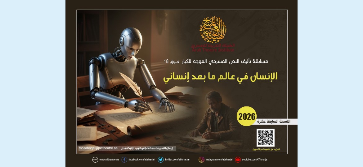 أعلنت الهيئة العربية للمسرح عن إطلاق النسخة السابعة عشرة لعام 2026 من مسابقة تأليف النص المسرحي الموجّه للكبار فوق سن 18 عامًا، والتي تأتي هذا العام تحت الناظم الدرامي: «الإنسان في عالم ما بعد إنساني»، في إطار برنامجها الثقافي والفني المنبثق عن استراتيجياتها المعتمدة.