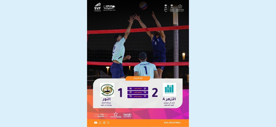 ففي المواجهة الأولى، حسم الأزهر B لقاءه أمام نادي الشعلة A بنتيجة شوطين دون مقابل (21-16، 21-10)، حيث قدّم الثنائي محمد حداد وأسامة تركستاني أداءً منضبطًا وقويًا، فرضا من خلاله إيقاعهما منذ البداية، مع تفوق واضح على مستوى الإرسال والاستقبال وإنهاء الكرات الحاسمة، ليؤكد الفريق أحقيته بالعبور بثقة إلى الأدوار الإقصائية.