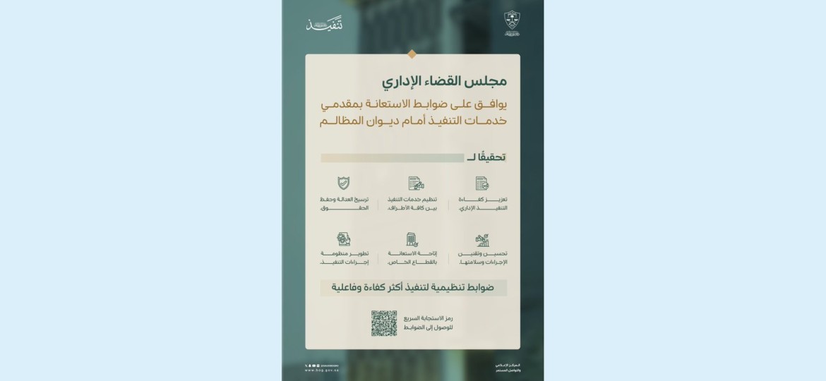 صدر قرار مجلس القضاء الإداري بالموافقة على ضوابط الاستعانة بمقدمي خدمات التنفيذ أمام ديوان المظالم، الهادفة إلى تنظيم خدمات التنفيذ وما يترتب عليه من أعمال وإجراءات، وما يشترطه لتنفيذها من ضوابط والتزامات من قبل الكيانات التي تقدم خدمات التنفيذ، وتراعي حقوق ومتطلبات أطراف التنفيذ في القضاء الإداري.