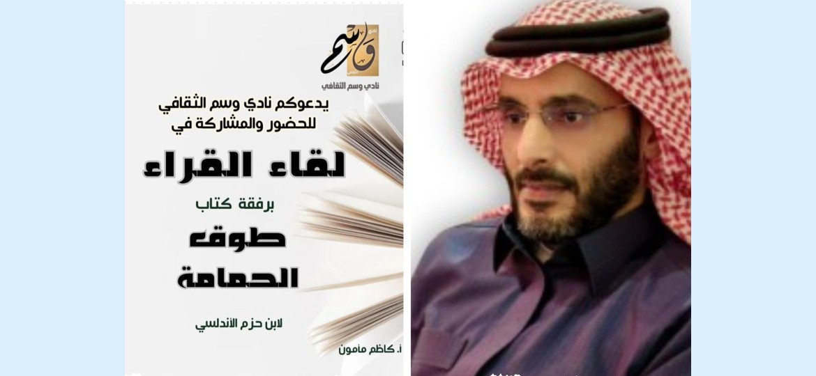 ضمن مبادرات الشريك الإدبي ومنصة هاوي تنظم لجنة القراء بنادي وسم الثقافي غداً السبت الموافق ٢١ فبراير في مقهى اروى لقاءها الشهري لمناقشة كتاب طوق الحمامة لإبن حزم الأندلسي الذي اختاره اعضاؤها حيث يتركز النقاش تأثير الثقافة الأندلسية على الكتابة وتوجهها والطابع العربي الذي بقي محافظاً على إصالته في اغلب الكتب