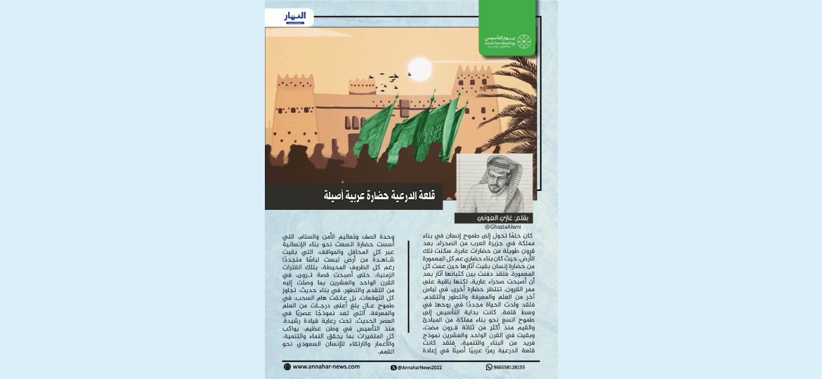 فلقد ولدت الحياة مجددًا في روحها في وسط قلعة، كانت بداية التأسيس إلى طموح اتسع نحو بناء مملكة من المبادئ والقيم منذ أكثر من ثلاثة قرون مضت، وبقيت في القرن الواحد والعشرين نموذج فريد من البناء والتنمية، فلقد كانت قلعة الدرعية رمزًا عربيًا أصيلًا في إعادة وحدة الصف وتعاليم الأمن والسلام، التي أسست حضارة اتسعت نحو بناء الإنسانية عبر كل المحافل والمواقف، التي بقيت شاهدةً من أرض لبست لباسًا متجددًا رغم كل الظروف المحيطة، بتلك الفترات الزمنية، حتى أصبحت قصة تروى، في القرن الواحد والعشرين بما وصلت إليه من التقدم والتطور، في بناء حديث، تجاوز كل التوقعات، بل عانقت هام السحب، في طموح عالٍ بلغ أعلى درجات من العلم والمعرفة، التي تعد نموذجًا عصريًا في العصر الحديث، تحت رعاية قيادة رشيدة، منذ التأسيس في وطن عظيم، يواكب كل المتغيرات بما يحقق النماء والتنمية، والأعمار والارتقاء للإنسان السعودي نحو القمم.