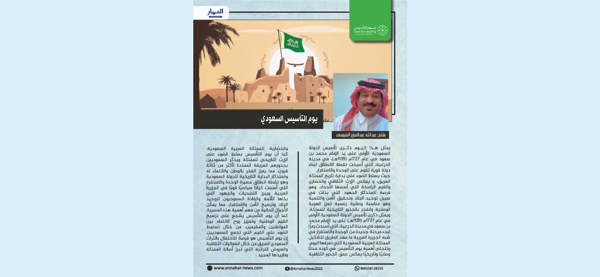 يمثل هذا اليوم ذكرى تأسيس الدولة السعودية الأولى على يد الإمام محمد بن سعود في عام 1727م (1139هـ)، في مدينة الدرعية، التي أصبحت نقطة الانطلاق لبناء دولة قوية تقوم على الوحدة والاستقرار.