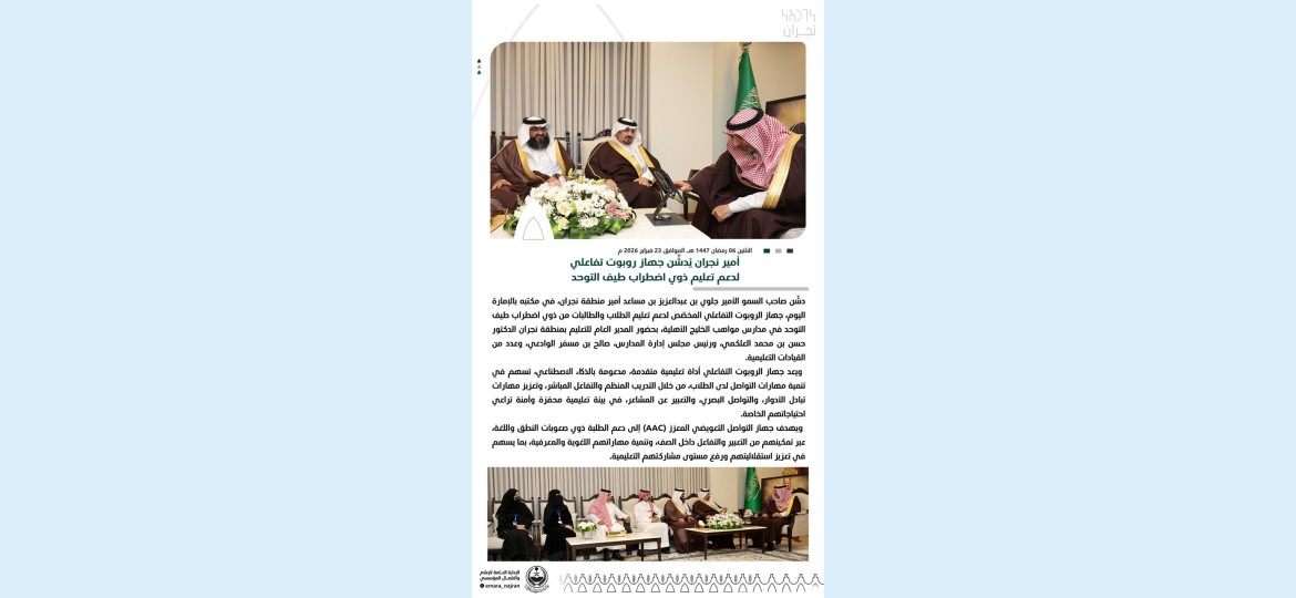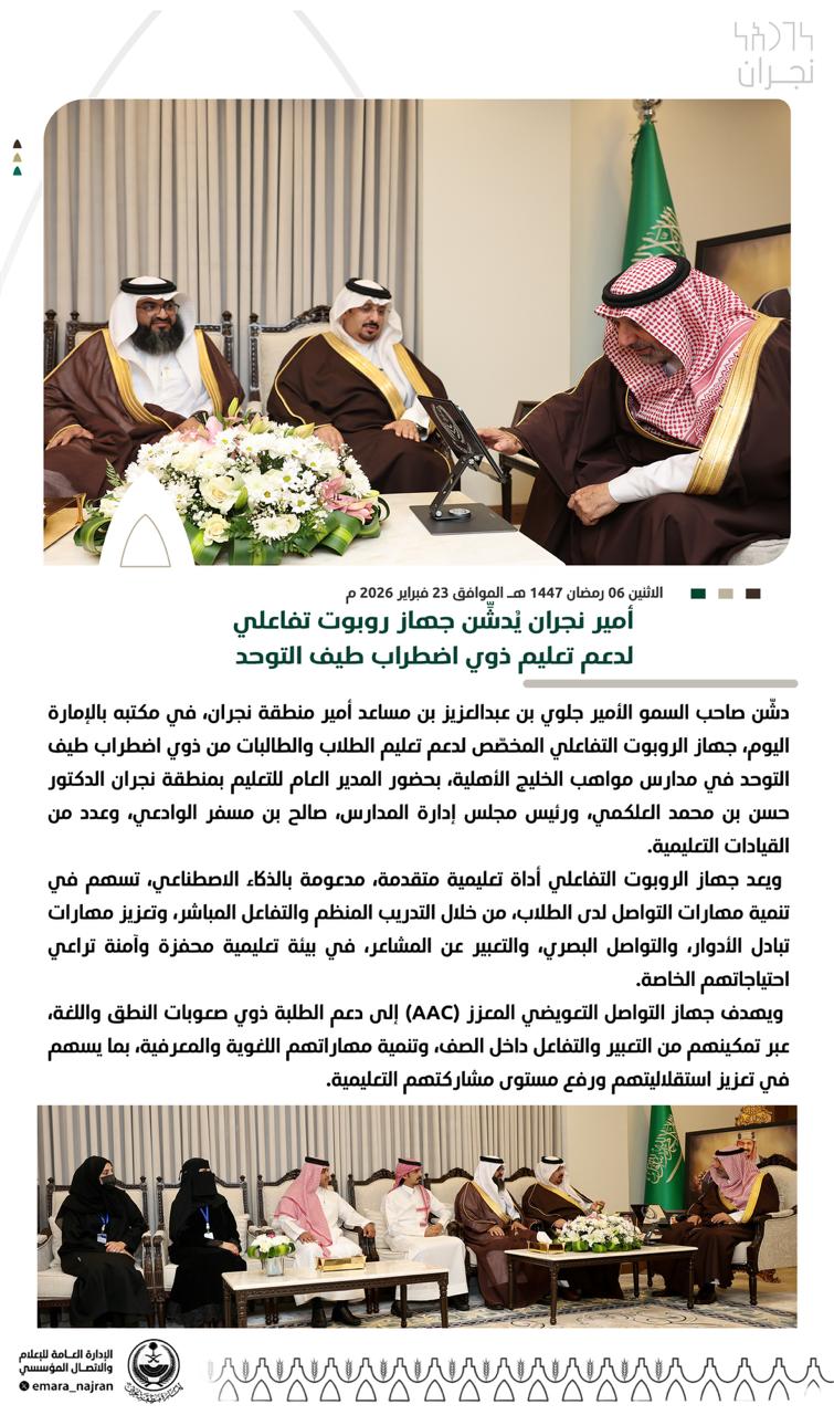 دشّن صاحب السمو الأمير جلوي بن عبدالعزيز بن مساعد أمير منطقة نجران، في مكتبه بالإمارة اليوم، جهاز الروبوت التفاعلي المخصّص لدعم تعليم الطلاب والطالبات من ذوي اضطراب طيف التوحد في مدارس مواهب الخليج الأهلية، بحضور المدير العام للتعليم بمنطقة نجران الدكتور حسن بن محمد العلكمي، ورئيس مجلس إدارة المدارس، صالح بن مسفر الوادعي، وعدد من القيادات التعليمية.