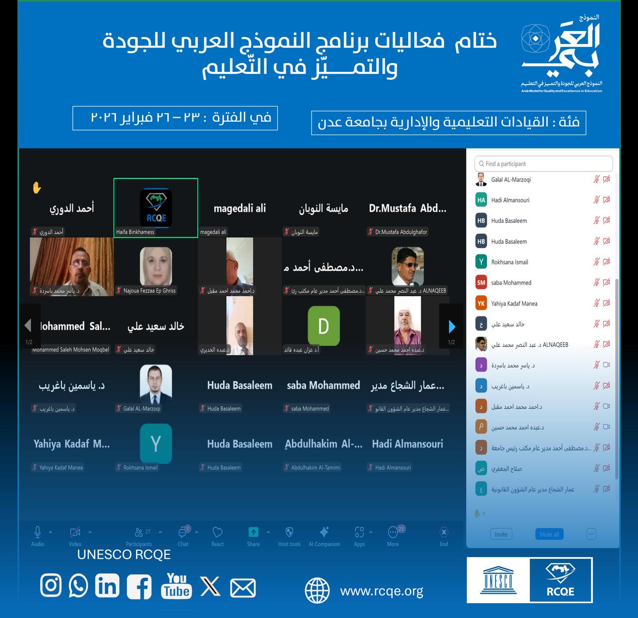 أطلق مركز اليونسكو الإقليمي للجودة والتميّز في التعليم بالمملكة العربية السعودية برنامج بناء القدرات لقيادات جامعة عدن بالجمهورية اليمنية بحضور رئيس الجامعة وكافة القيادات الأكاديمية والإدارية بالجامعة ، حول التعريف بـ النموذج العربي للجودة والتميّز في التعليم، وذلك في إطار جهوده لتعزيز ثقافة الجودة المؤسسية والمواءمة مع المعايير الإقليمية والدولية، ودعم مسارات التحول الاستراتيجي في مؤسسات التعليم العالي العربية.