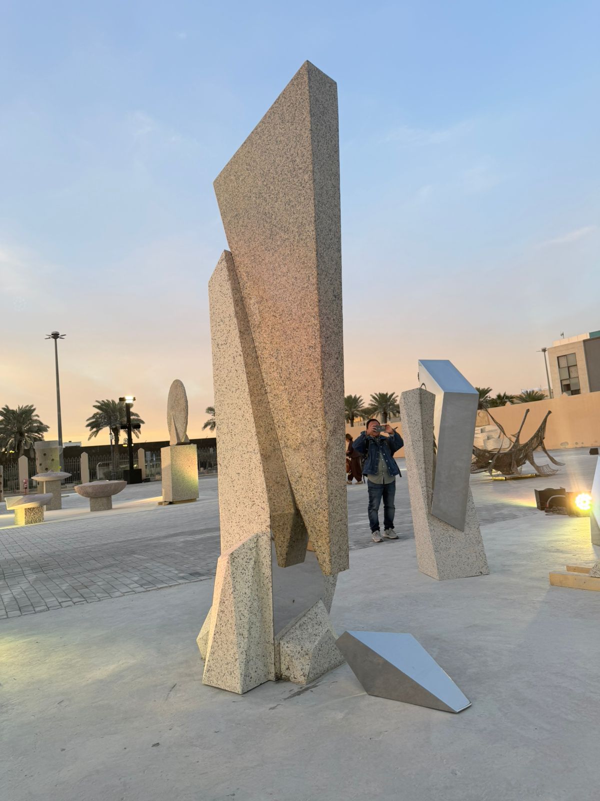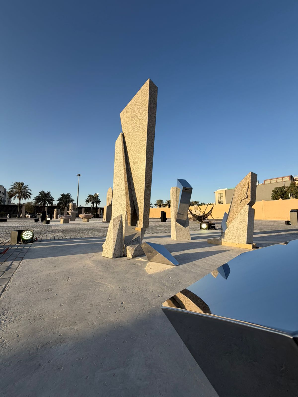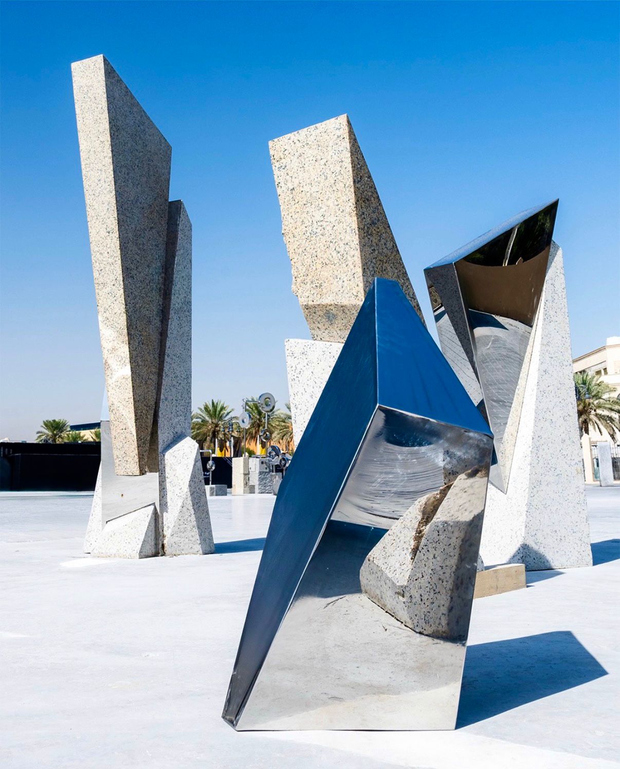 ترمز كتل الجرانيت إلى الهوية الراسخة والذاكرة المكانية التي قامت عليها المدينة، بما تحمله من دلالات الثبات والاستمرارية. في المقابل، تحضر قطع الفولاذ المصقولة كتمثيل للحاضر المتحوّل والبعد الحداثي، حيث تعكس الضوء والمحيط في إشارة إلى الانفتاح والتفاعل مع العالم. ويؤسس التفاعل بين الخامتين علاقة تكاملية تعيد تعريف الحداثة بوصفها مسارًا تراكميًا لا قطيعة فيه مع الجذور.