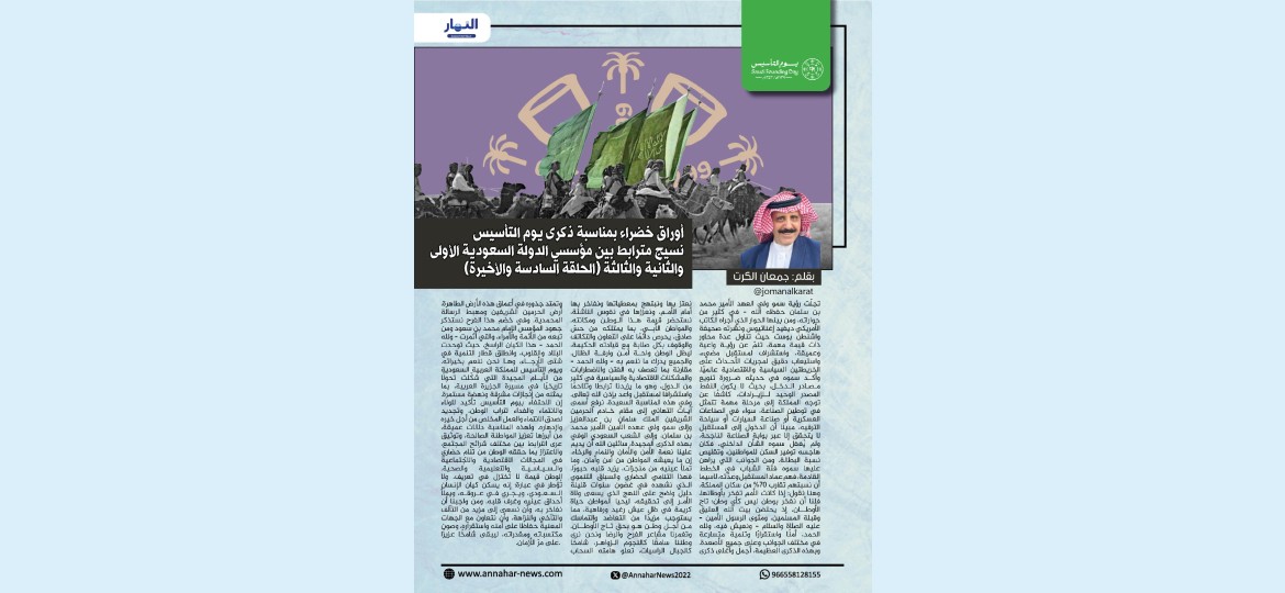 ويوم التأسيس للمملكة العربية السعودية من الأيام المجيدة التي شكّلت تحولًا تاريخيًا في مسيرة الجزيرة العربية، بما يمثله من إنجازات مشرقة ونهضة مستمرة.