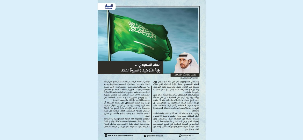 ويمثّل *العلم السعودي* رمزًا وطنيًا فريدًا، إذ لم يكن يومًا مجرد راية تُرفع في المناسبات، بل ظل شاهدًا على تاريخٍ ممتد من الثبات والرسالة، منذ أن رفعه موحد الدولة الملك عبدالعزيز بن عبدالرحمن آل سعود – طيب الله ثراه – ليكون راية دولةٍ قامت على التوحيد، وجعلت من خدمة الدين وعمارة الأرض نهجًا ثابتًا لها.