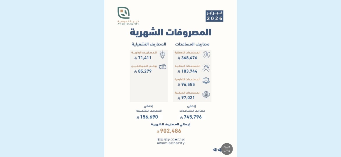 أقرّ مجلس إدارة جمعية العوامية الخيرية، برئاسة المهندس حسن عبدالله آل لباد، المصروفات المالية لشهر فبراير 2026م، بإجمالي بلغ 902,486 ريالًا، وذلك ضمن إطار الشفافية المالية واستمرار العمل الخيري المنظم الذي تنتهجه الجمعية في إدارة مواردها وبرامجها.