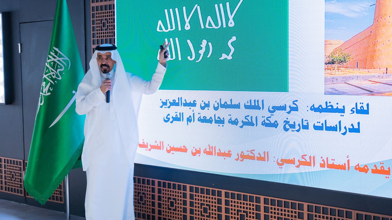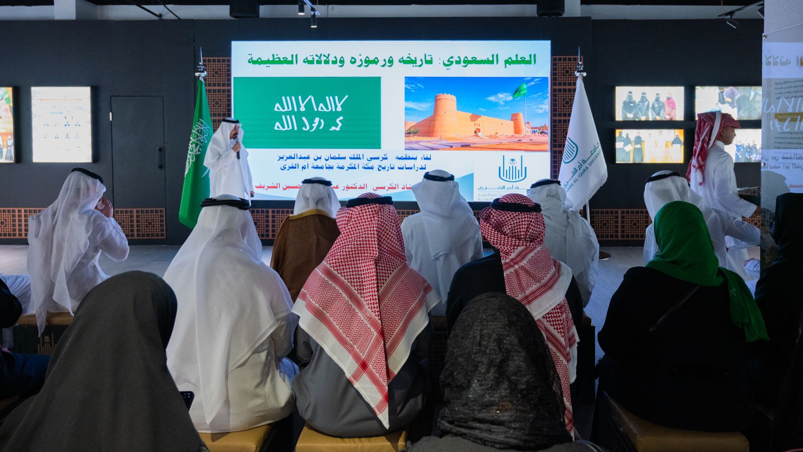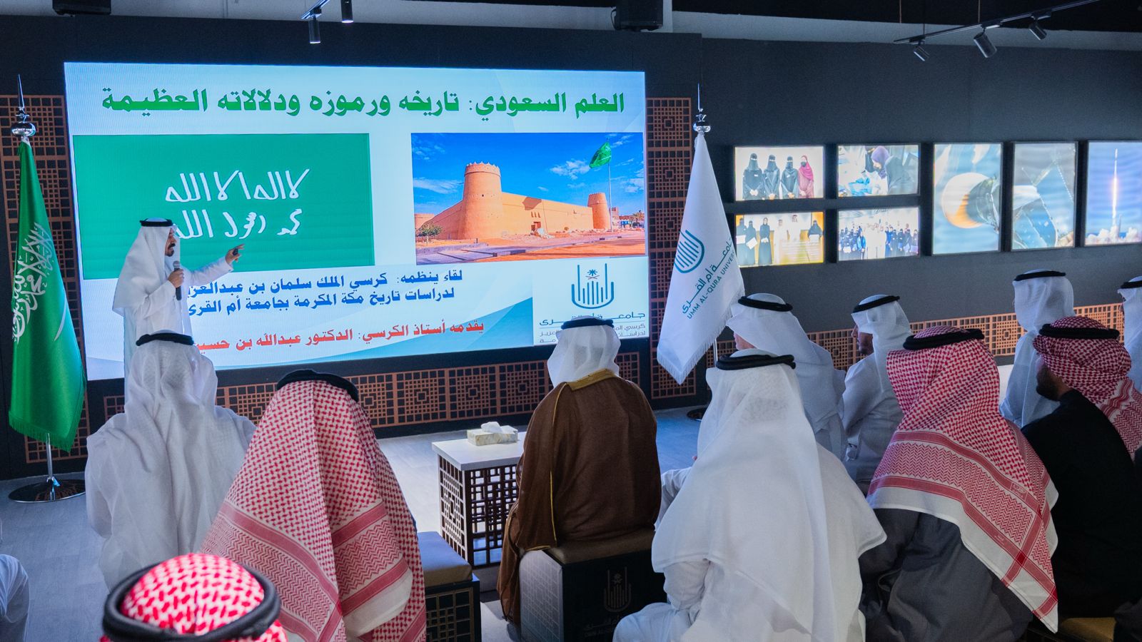 برعاية وحضور رئيس جامعة أمِّ القُرى، أ.د. معدي بن محمد آل مذهب، نظَّم كرسي الملك سلمان بن عبدالعزيز لدراسات تاريخ مكة المكرمة لقاءً علميًّا بعنوان: «العَلَم السُّعوديّ.. تاريخه ورموزه ودلالاته»، ضمن فعاليات الجامعة المنعقدة بمناسبة يوم العَلَم. شهد اللقاء حضورًا لافتًا من الطلبة، والمنسوبين، وعددًا من عمداء الكليات والمعاهد والعمادات.
