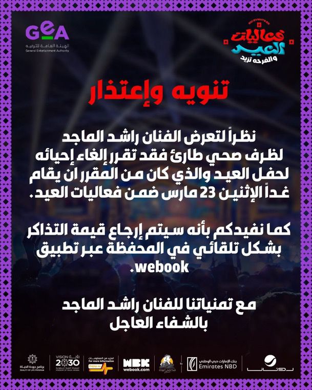ولم يقف الأمر عند حدود الإلغاء، بل امتد ليعكس نضجًا تنظيميًا ملحوظًا، إذ أوضحت الجهة المنظمة أن قيمة التذاكر ستُعاد تلقائيًا عبر منصة webook، في خطوة تعزز ثقة الجمهور وتؤكد احترافية إدارة الفعاليات في المملكة، خصوصًا في ظل الزخم الكبير الذي تشهده روزنامة الترفيه.