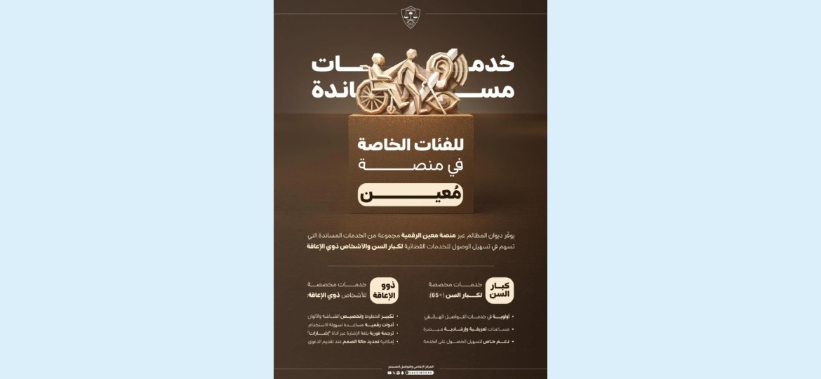 وتضمّن الإعلان عددًا من الامتيازات التي توفّرها بوابة ديوان المظالم ومنصة مُعين الرقمية للأشخاص ذوي الإعاقة، تمثلت في مجموعة من الأدوات الرقمية المساعدة، التي تشمل تكبير حجم الخطوط وتخصيص الشاشة والألوان، إضافةً إلى أداة (إشارات) التي تتيح للصم الترجمة بلغة الإشارة، بما يمكّنهم من الاستفادة من خدمات التقاضي بأنفسهم عند اختيار خيار (هل الطرف من الصم) أثناء تقديم الدعوى.