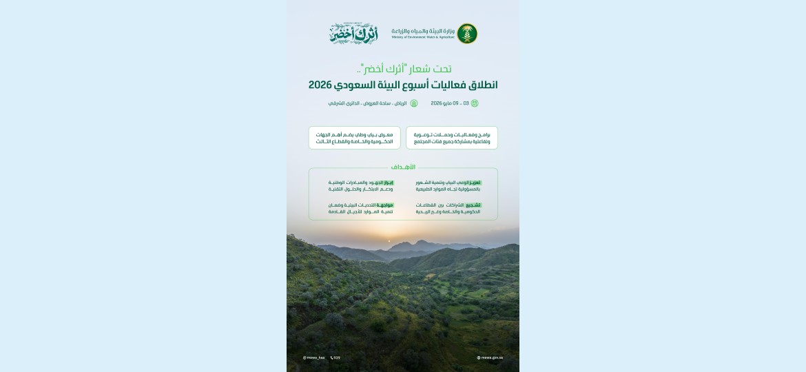 أعلنت وزارة البيئة والمياه والزراعة، انطلاق فعاليات أسبوع البيئة السعودي 2026م تحت شعار "أثرك أخضر" في 16 ذو القعدة 1447هـ الموافق 3 مايو المقبل في مدينة الرياض، تزامنًا مع برامج وفعاليات وحملات توعوية وتفاعلية بمشاركة جميع فئات المجتمع، على مدار أسبوع كامل في مختلف مناطق المملكة.