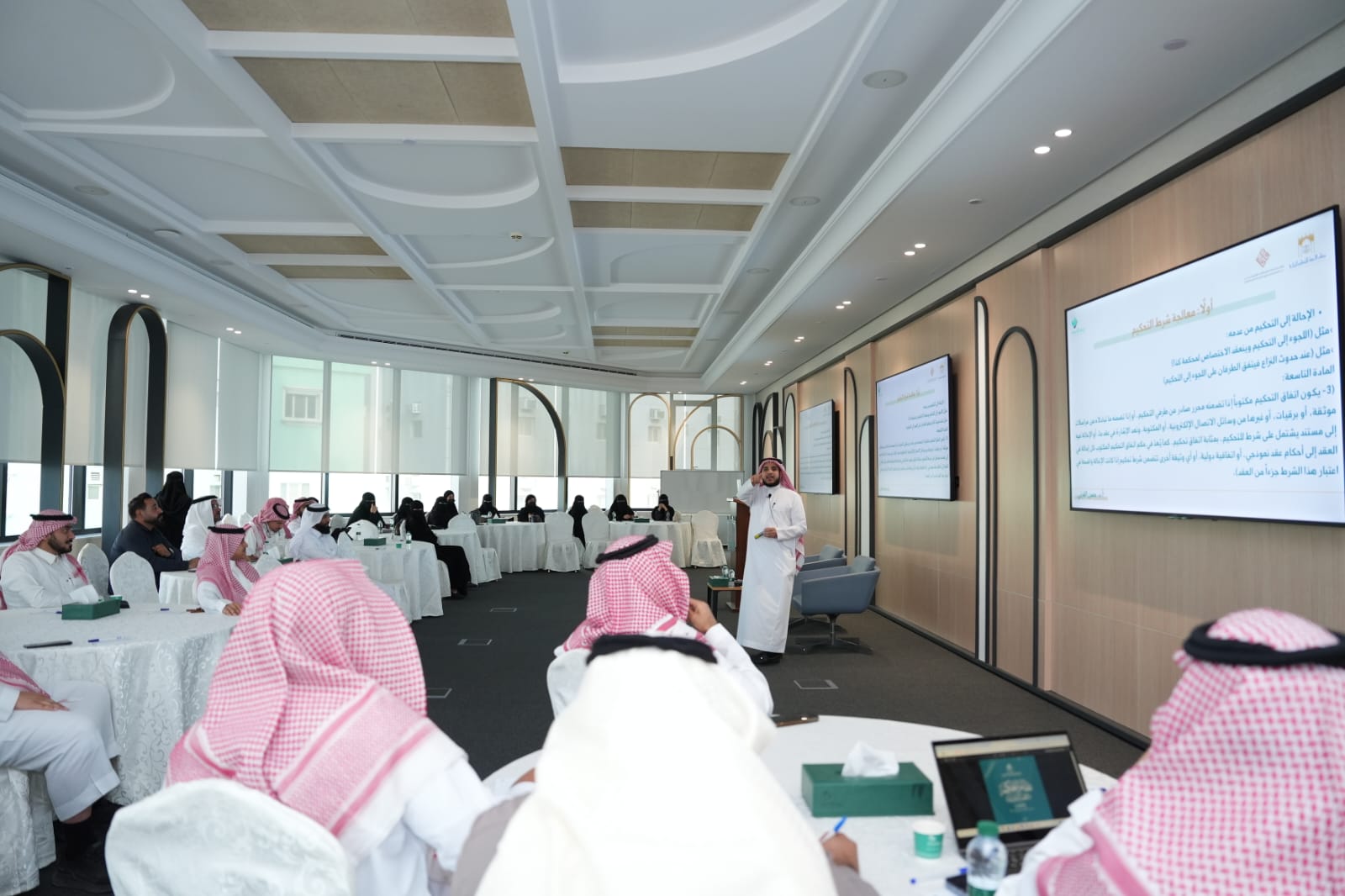 وقدّم الورشة الأستاذ الدكتور حسن القرني المُحكّم الممارس وأستاذ الفقه المقارن في كلية الشريعة بجامعة الملك فيصل، والدكتور محمد السيد الهاشم المحامي والمُحكّم المعتمد والمؤسس والدير العام لشركة فاصلة للمحاماة والاستشارات القانونية، بمشاركة (40) مشاركًا ومشاركة من المحامين والمحاميات الشباب وخريجي وخريجات كليات الحقوق والقانون.