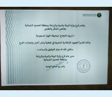 قدّم فرع وزارة البيئة والمياه والزراعة بمنطقة الحدود الشمالية شهادة شكر وتقدير لصحيفة "النهار السعودية"، تقديراً لجهودها الإعلامية المتميزة في تغطية ونشر أخبار وإنجازات الفرع.