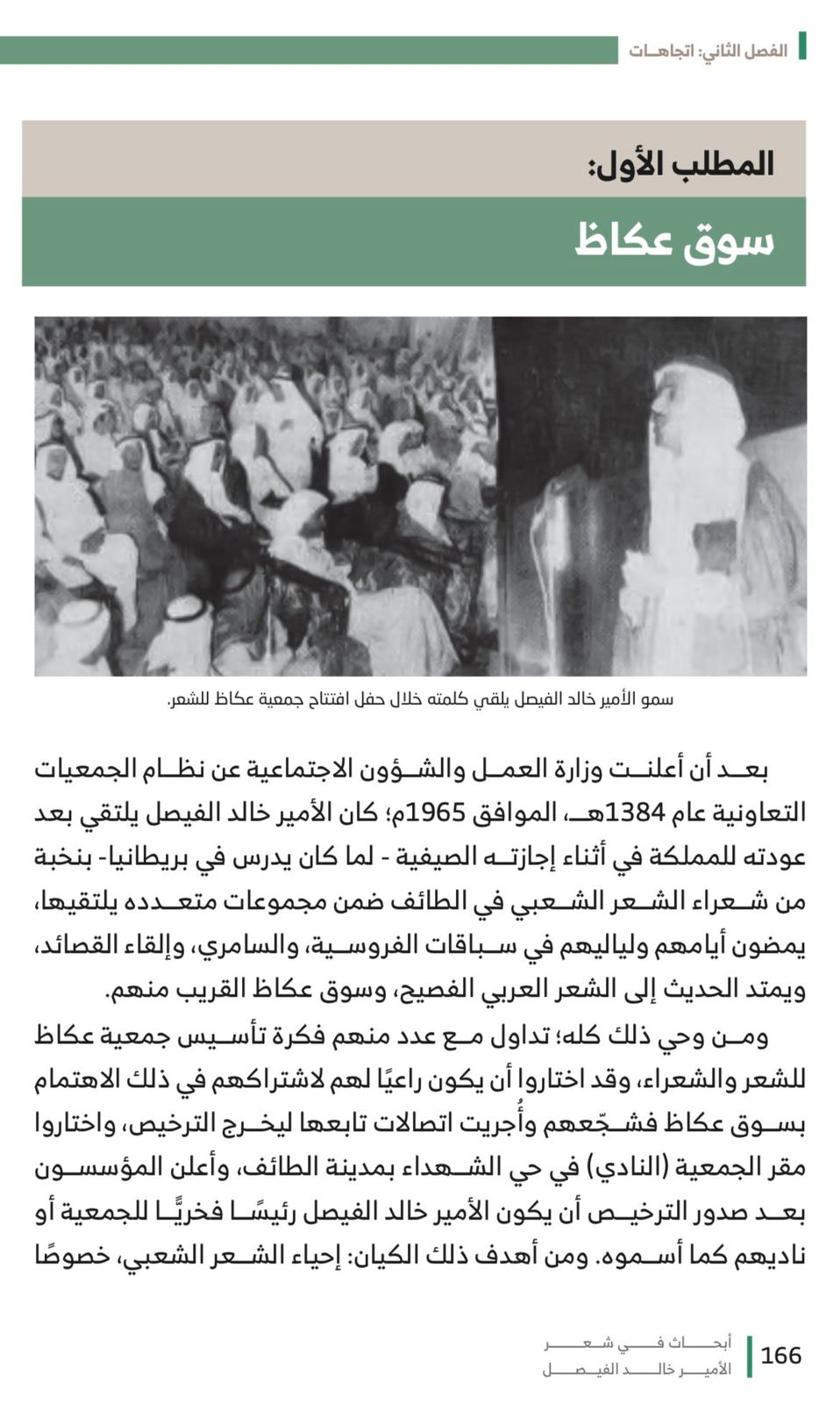 كما استعرض الكتاب مبادرات الأمير الثقافية، ومن أبرزها إحياء سوق عكاظ عام 1385هـ، وتنظيم أول مهرجان للشعر الشعبي في منطقة عسير عام 1393هـ، بمشاركة نخبة من الأدباء والشعراء، من بينهم عبدالله بن خميس.