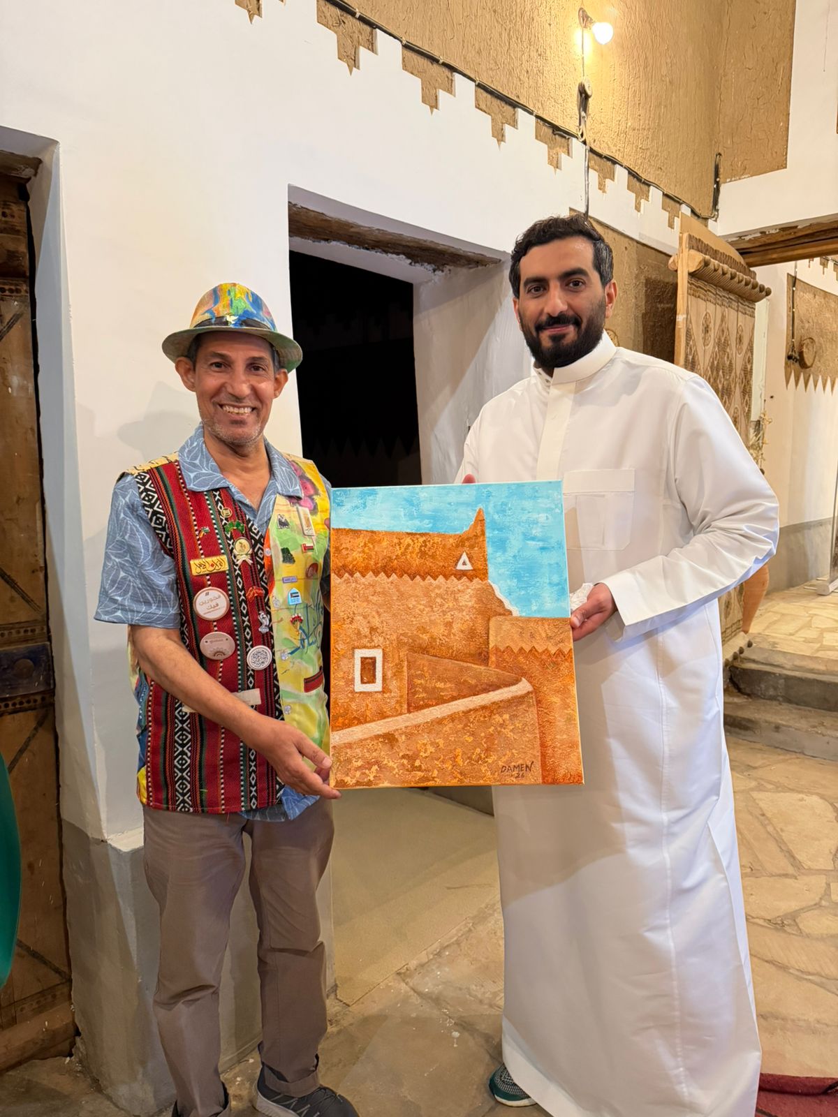 واختتم الإقامة بتقديم باقتين من الحب ، الأولى إلى ادارة الجمعية والثانية إلى رئيس غرفة عنيرة التجارية ، وهي لوحات تحاكي المكان الذي احتضن الإقامة الفنية ( قصر السبيعي التراثي .