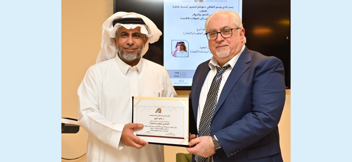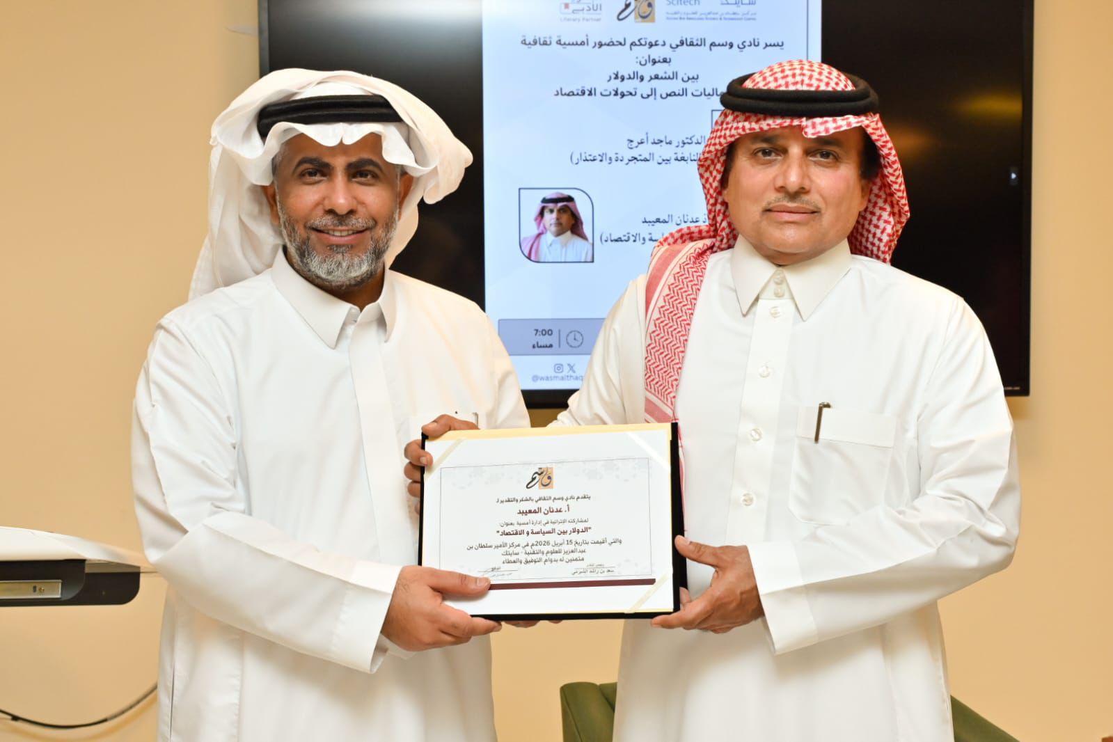 نظّم نادي وسم الثقافي مساء يوم الأربعاء 15 أبريل 2026م أمسية ثقافية مميزة بعنوان " بين الشعر والدولار " من جماليات النص إلى تحولات الاقتصاد”، وذلك في مركز سايتك بمحافظة الخبر، بحضور نخبة من المثقفين والمهتمين بالشأن الأدبي والاقتصادي