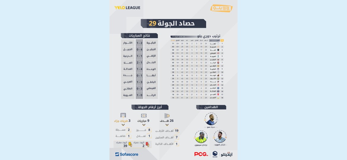 اختُتمت منافسات الجولة الـ29 من دوري يلو للمحترفين على إيقاع الإثارة، بعدما شهدت تسجيل 26 هدفاً في 9 مباريات، وسط تفوق واضح للاعبين الأجانب الذين سجلوا 19 هدفاً مقابل 7 أهداف سعودية، في جولة حفلت أيضاً بثلاث ركلات جزاء سُجلت اثنتان منها، إلى جانب هدف عكسي واحد.