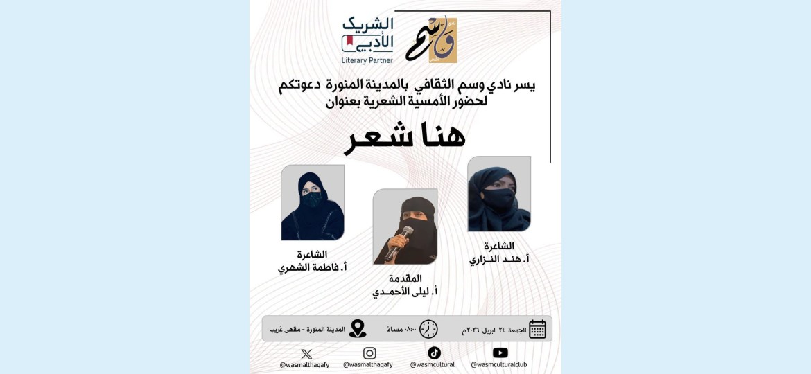 ينظم نادي وسم الثقافي أمسية شعرية مميزة في المدينة المنورة بعنوان «هنا شعر»، وذلك مساء يوم الجمعة 24 أبريل 2026م، في مقهى عريب، عند الساعة الثامنة مساءً، ضمن برامجه الثقافية الهادفة إلى إثراء المشهد الأدبي وتعزيز حضور الشعر في الفضاء الثقافي.
