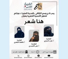 ‎وتستضيف الأمسية الشاعرتين الأستاذة فاطمة الشهري والأستاذة هند النزراري، حيث ستقدمان باقة من النصوص الشعرية التي تعكس تجارب متنوعة ورؤى إبداعية ثرية، فيما تتولى تقديم وإدارة الأمسية الأستاذة ليلى الأحمدي، التي ستقود الحوار وتنسّق فقرات اللقاء بأسلوب يجمع بين التفاعل والطرح العميق.