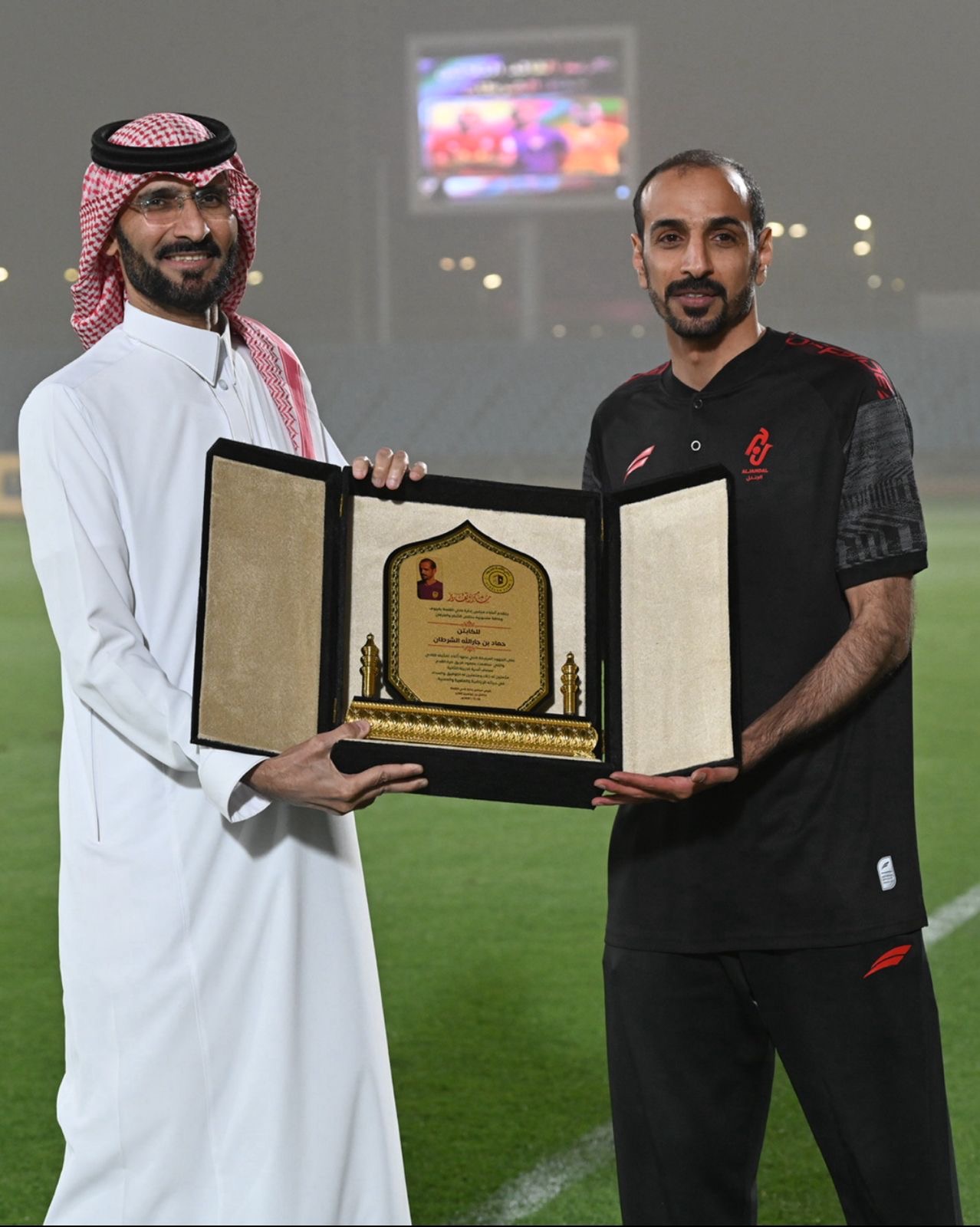وتزينت ساعة ملعب المباراة بصورة اللاعب حماد الشرطان، مرفقة بشعارات الأندية الثلاثة وعبارة “القائد الثلاثي”، في لفتة تعبيرية جسدت حجم التقدير والاعتزاز بمسيرته.