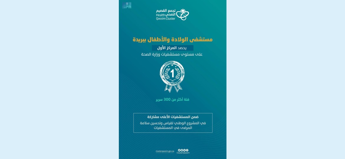 حصل مستشفى الولادة والأطفال في بريدة على المركز الأول بالمملكة في الأسبوع الثالث للدورة الخامسة من المشروع الوطني لقياس وتحسين ثقافة سلامة المرضى في المستشفيات التابعة لوزارة الصحة، والتي تستمر 8 أسابيع.